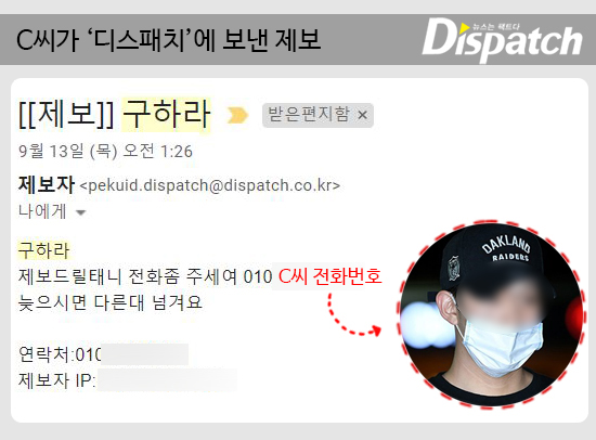 C씨는 '디스패치' 제보란에 글을 올렸다. "구하라에 대한 제보가 있다"며 연락처를 남겼다. 그 시각이 새벽 1시 26분. 구하라와 싸움을 끝낸 지, 10여 분 만이다.