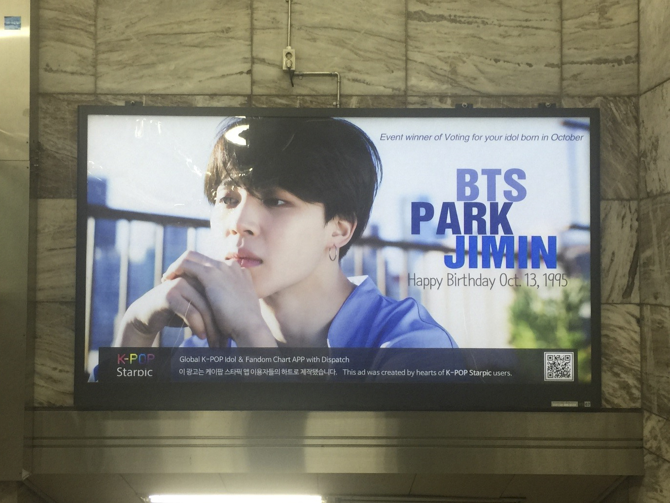 ‘케이팝 스타픽’ 측은 투표 결과에 따라 지민의 생일 축하 전광판을 준비했다. 10월 한 달간 서울 7호선 강남구청역에서 스크린 광고로 만날 수 있다.