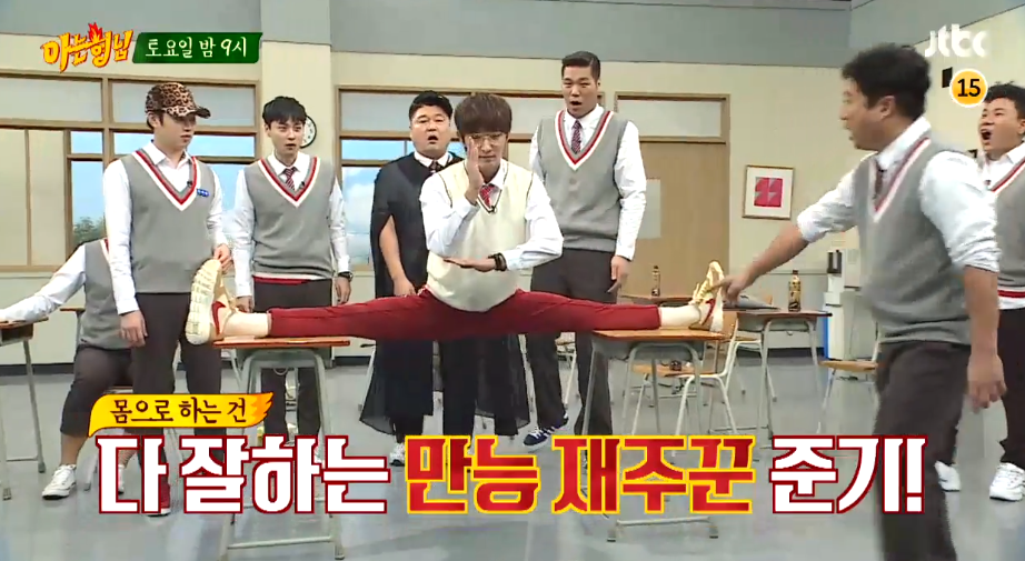 이준기는 카리스마 벗어던지고 코믹 매력을 선보였습니다. 강호동을 흉내내는가 하면, 화제의 CF송 '미녀는 석류를 좋아해'를 노래했죠. 다리찢기는 옵션.