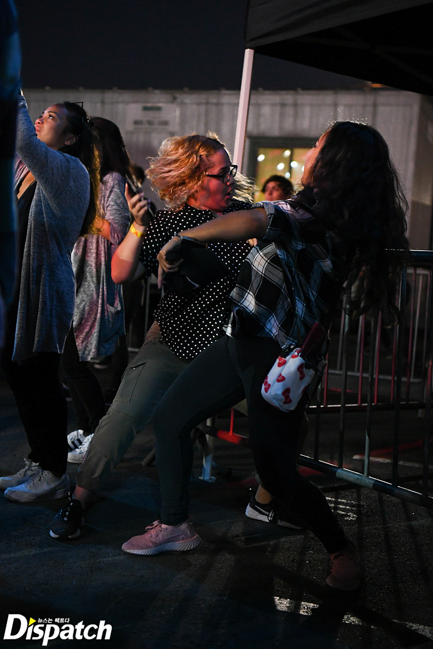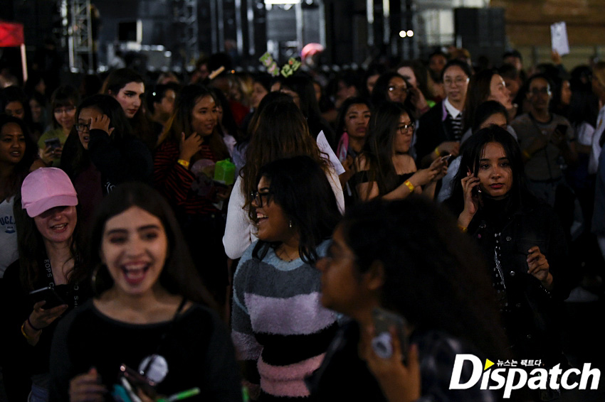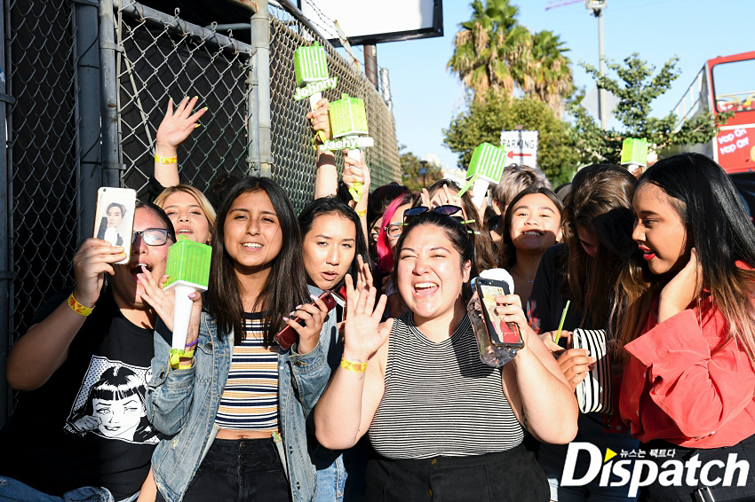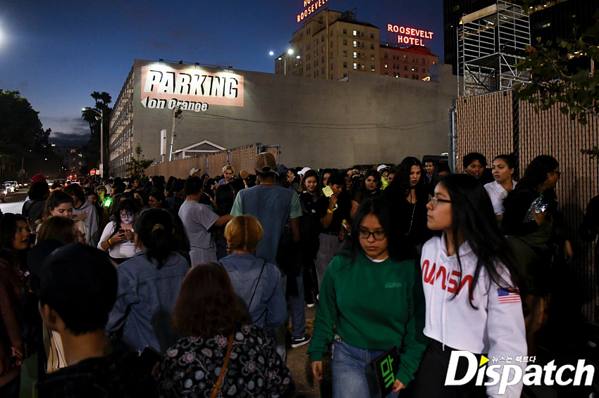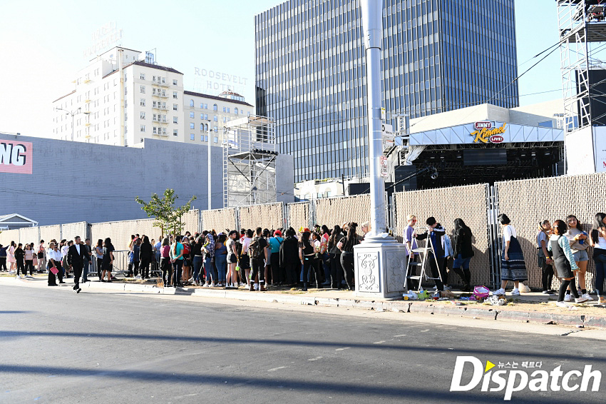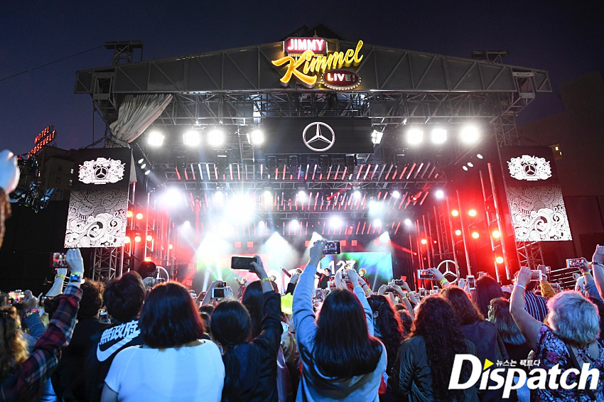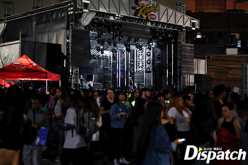 먼저, '지미 키멜 라이브쇼' 현장입니다. LA 할리우드 중심에 있는 야외 무대입니다. 이미 주변은 해외 팬들로 가득 찼습니다. 입장 전부터 멤버들의 이름을 외치고, 노래를 부릅니다.