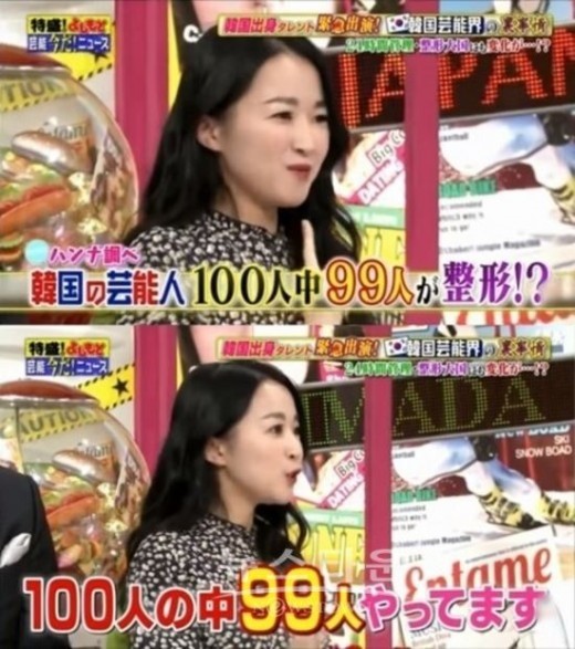앞서 강한나는 27일 일본 요미우리TV '토쿠모리 요시모토'에 출연해 "한국 연예인 100명 중 99명은 성형을 한다"며 "한국 연예인 친구들이 많은데 만날 때마다 얼굴이 변한다. 했다고 말하지는 않지만 가만히 보면 부끄러워한다"고 말했다.