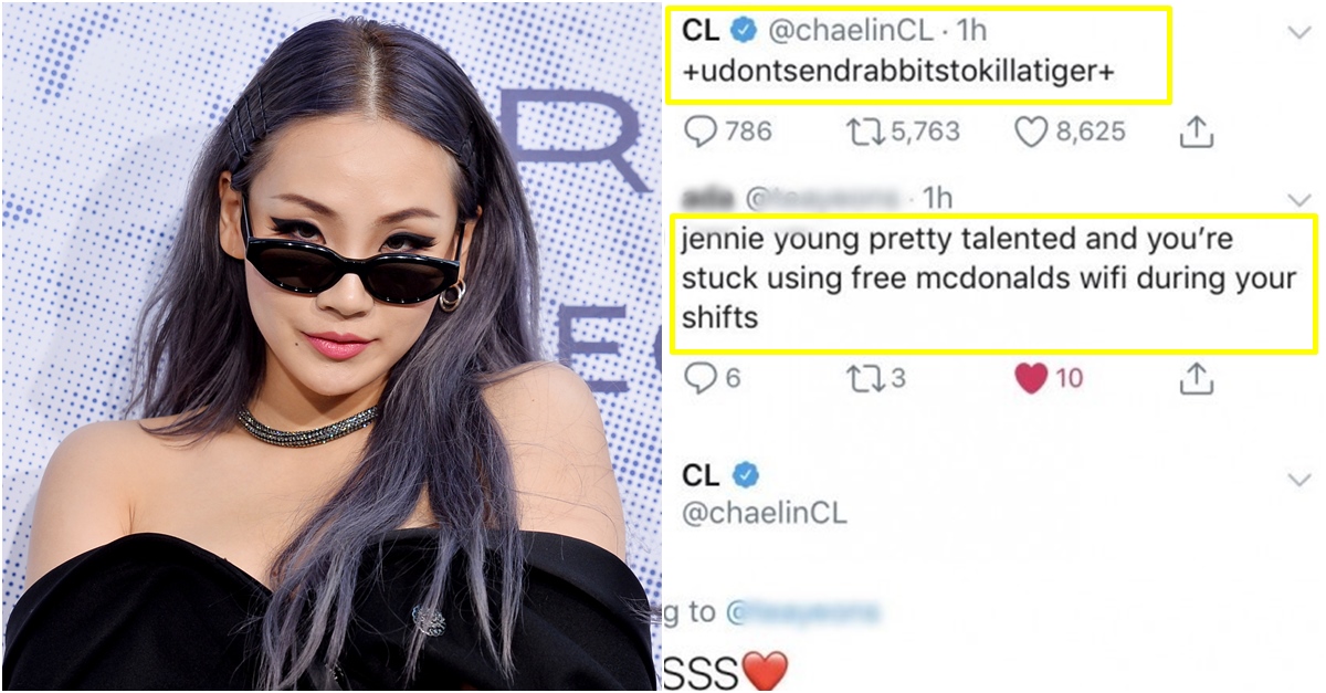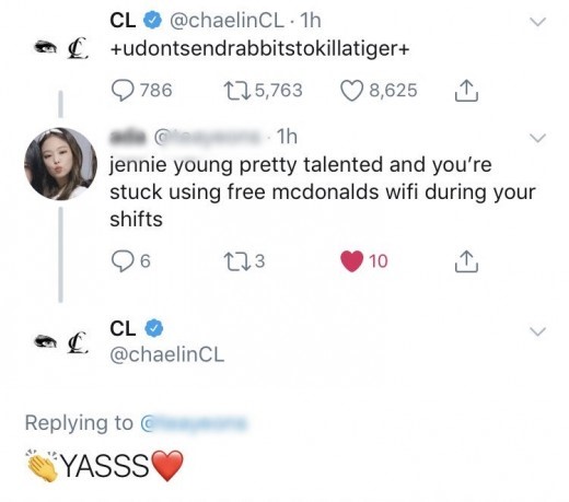"토끼로는 호랑이를 죽일 수 없다"는 씨엘의 글에 한 해외 네티즌이 "제니는 젊고 예쁘고 재능있고, 당신은 근무시간에 맥도날드 무료 와이파이나 쓰는 신세"라는 글을 더했다. 명백한 조롱이다. 네티즌의 트위터 프로필 사진은 블랙핑크 제니의 얼굴이다.