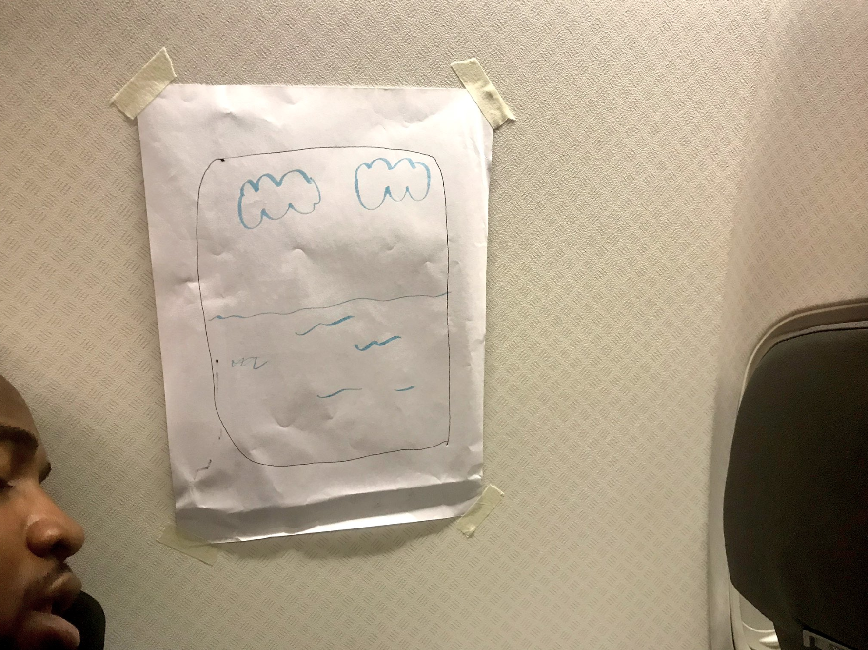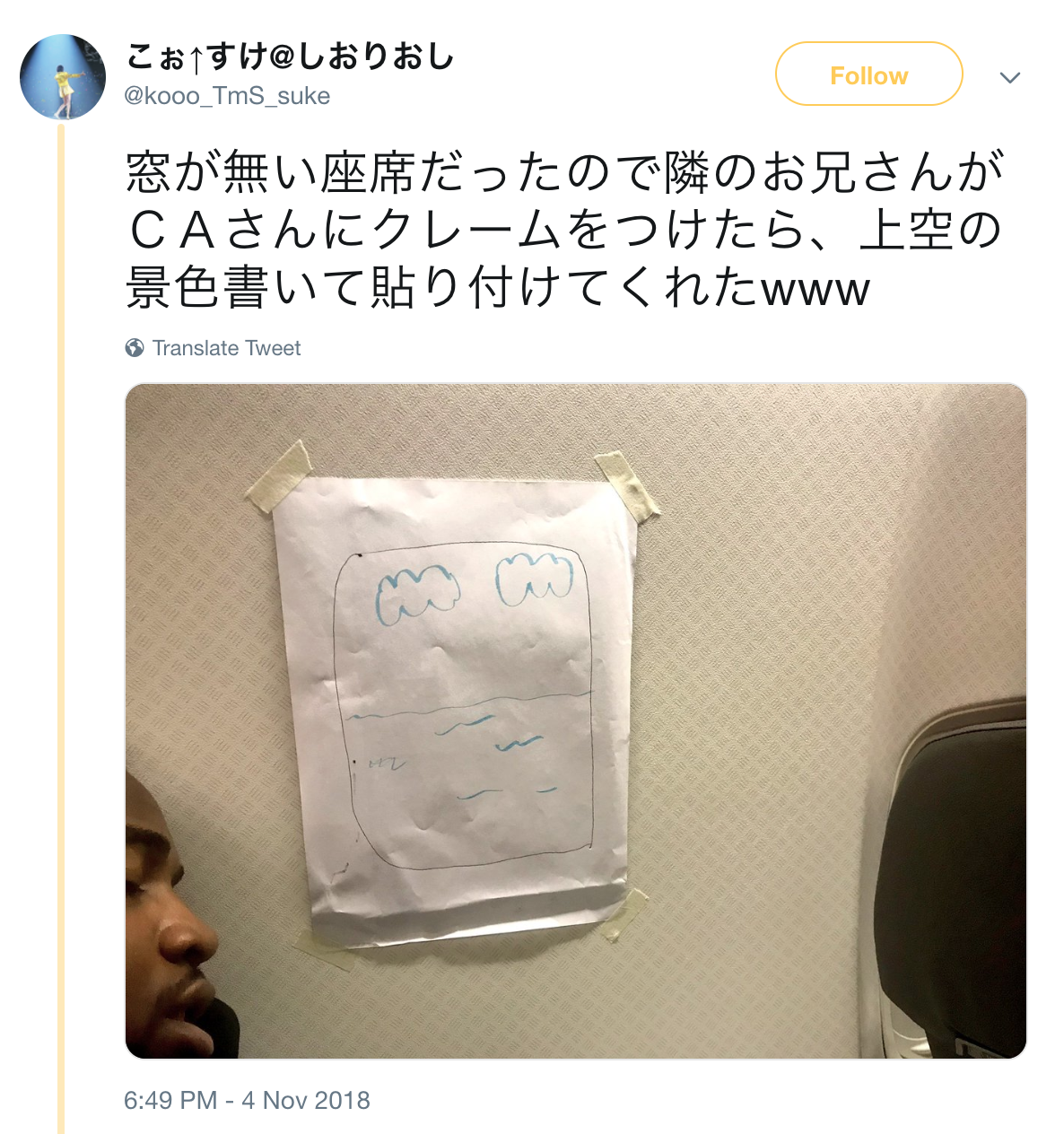 승객이 불만을 표하자, 금세 종이에 창문 그림을 그려 승객의 옆에 붙여주었습니다.