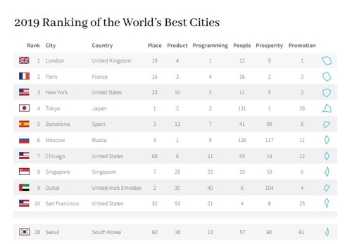 미국 뉴욕과 캐나다 밴쿠버에 기반을 둔 다국적 컨설팅업체 '레조넌스 컨설턴시'(Resonance Consultancy)가 최근 발표한 '2019 세계 최고 도시'(World's Best Cities) 순위에서 서울은 28위에 올라있다.