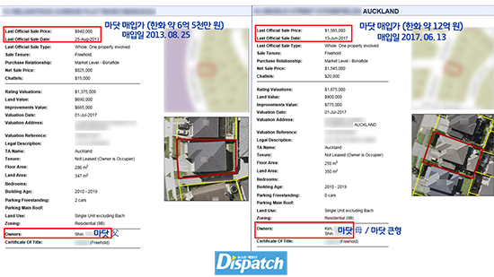 '디스패치'는 해당 주소의 등기부를 확인했다. 현재 신 씨 소유였다. 구입일은 2013년 8월. 당시 84만 NZ달러 (한화 6억 5,000만 원)을 주고 매입했다.