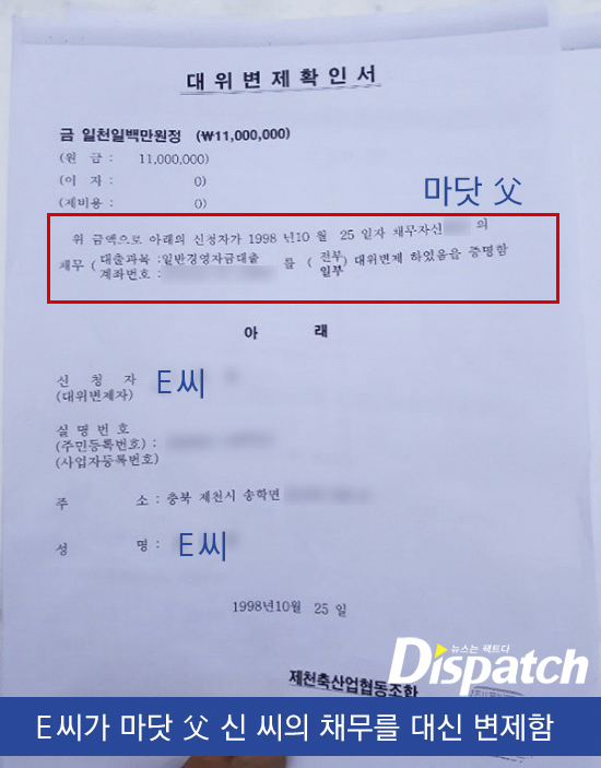 E씨 역시 마찬가지. 신 씨의 빚을 그대로 떠안았다. 그가 갚은 연대보증 채무는 1,100만 원. D씨 측은 1998년 10월 25일 날짜가 찍힌 대위 변제확인서를 제공했다.