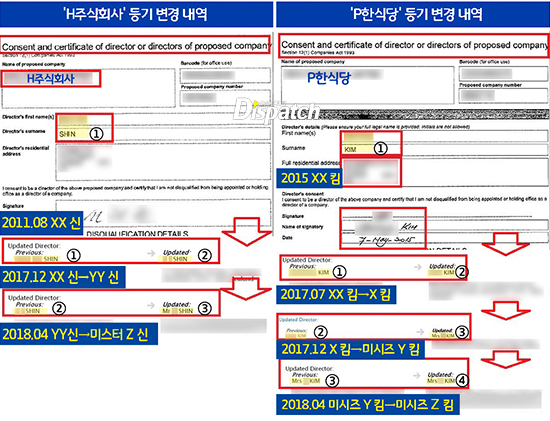 그렇다면, 왜 신 씨와 김 씨 이름으론 아무것도 검색되지 않았을까. '디스패치'는 법인등기를 통해 재미있는 사실을 발견했다. 신 씨와 김 씨의 이름 변천사다.