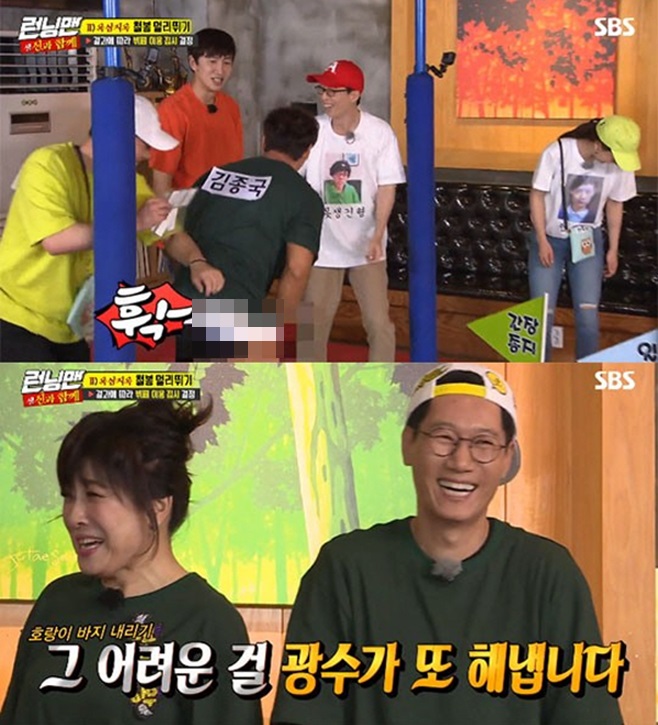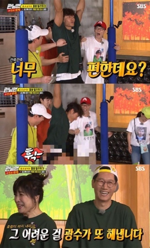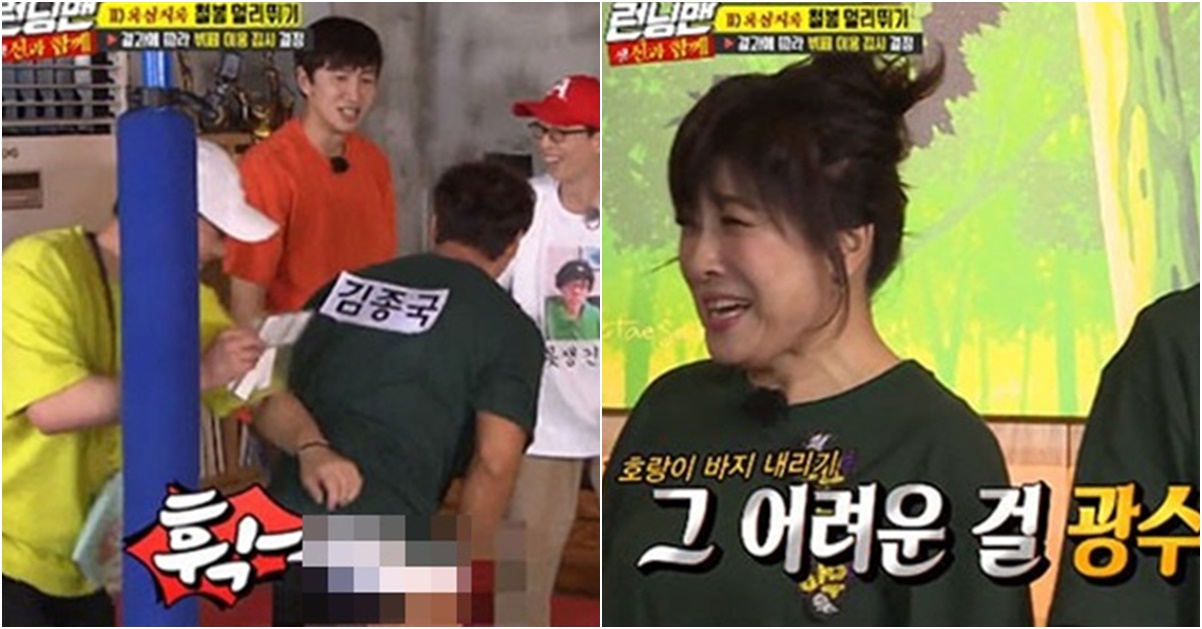 지난 8월 26일 방송된 ‘런닝맨’ 속 장면이 문제가 됐다. 이광수가 철봉에 매달린 김종국의 바지를 벗기고, 속옷이 드러났다. 제작진은 이를 모자이크 처리하거나 호랑이 그림으로 가리고 '그 어려운 걸 또 해냅니다', '(철봉 정면 자리가)뜻밖의 명당'이라는 자막을 내보냈다. 노사연이 "난 못 봤어. 재수도 없지"라고 말해 더욱 문제로 지적됐다.