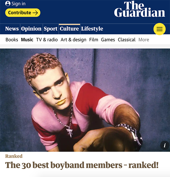 가디언이 선정한 역대 최고의 보이그룹 멤버 1위는 ‘잭슨파이브’ 마이클 잭슨이다. ‘테이크 댓’ 로비 윌리엄스가 2위를 차지했다.