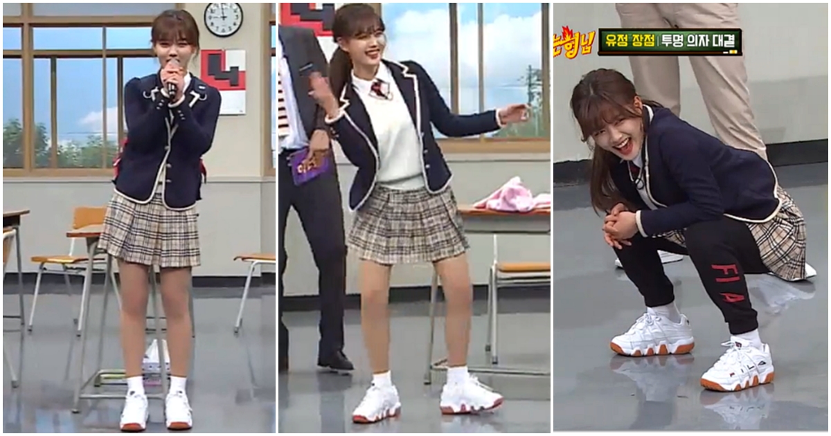 김유정은 얼마 전 ‘아는 형님’에서도 교복상의+백팩+플리츠스커트+체육복바지+운동화를 신고 나와 시청자들의 눈길을 끌었죠.