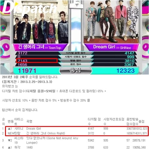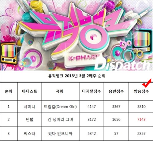 단, '방송점수'는 다르다. 점유율을 따지지 않는다. 일정 횟수 이상 방송에 출연하면 20%를 따먹을 수 있다. 실제 지난 11일 방송, 틴탑의 '긴생머리 그녀'는 음원 '2172'점, 음반 '1656'점을 얻었다. 음원 점수는 컴백 5주차인 '씨스타'보다 낮았다. 하지만 방송점수로 '7143'점을 얻어 '씨스타'를 제치고 2위에 올랐다.