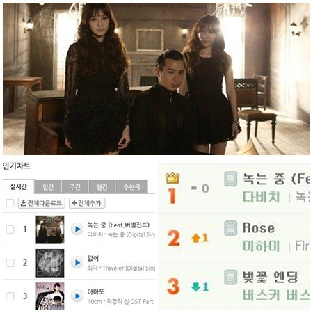 다비치는 지난 1일 신곡 '녹는 중'을 공개했다. 이 곡은 2일 오전 멜론, 벅스, 소리바다, 엠넷, 네이버뮤직, 다음뮤직, 몽키3 등 7대 주요 음원 차트 1위를 기록 중이다. '거북이', '둘이서 한잔해'에 이어 3연속 정상을 휩쓸었다.