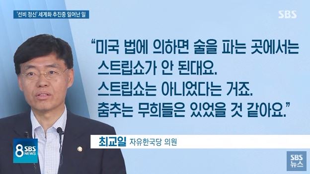 자유한국당 최교일 의원은 "미국 법에 따르면 술 파는 곳에는 스트립쇼가 안 된다", "(따라서) 스트립쇼는 아니었고, 춤추는 무희들은 있었을 것 같다"고 말했습니다.