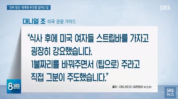 미국 관광 가이드 대니얼 조 씨는 "식사 후에 미국 여자들이 나오는 스트립바를 가자고 굉장히 강요했다. 1불짜리를 바꿔주면서 (팁으로) 주라고 직접 그분이 주도했다"고 말했습니다.