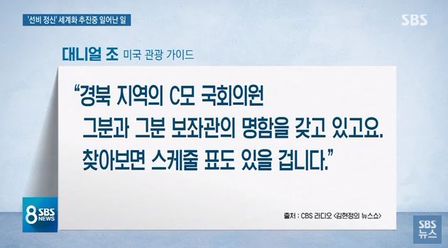 31일 'SBS 뉴스'에 따르면, 미국 관광 가이드 대니얼 조 씨가 국회의원 관련 경험을 폭로했습니다.