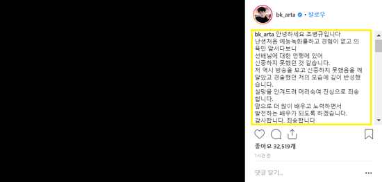 [Dispatch=최지영기자] 연기자 조병규가 윤세아를 상대로 한 발언이 도마 위에 올랐다. 이에 1일 직접 인스타그램을 통해 사과문을 올렸다.