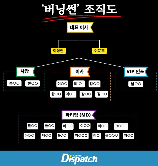 '디스패치'는 '버닝썬'의 내부 조직도를 입수했다. 대표님, 사장님, 이사님, VIP인포 등으로 간부 이름이 나열돼 있다. '버닝썬' 논란에 서있는 '장XX' 이사의 이름도 보인다.