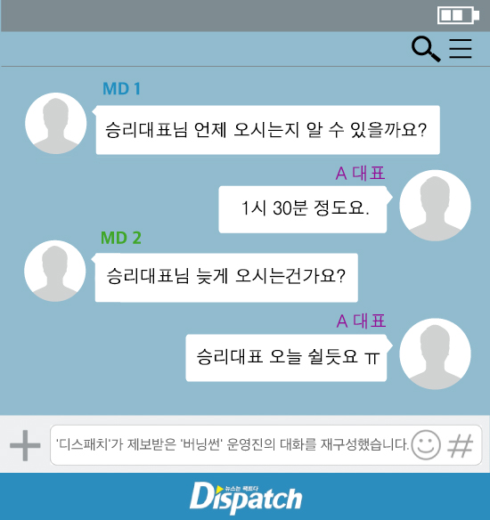 '디스패치'는 '버닝썬' 운영자가 모인 단체톡 대화 내용을 입수했다. 특히 '이XX' 이사의 대화는 충격적이다. 그는 '버닝썬' 조직도에 이사로 등재된 인물. 게스트 및 픽업(부킹) 담당 이사다.
