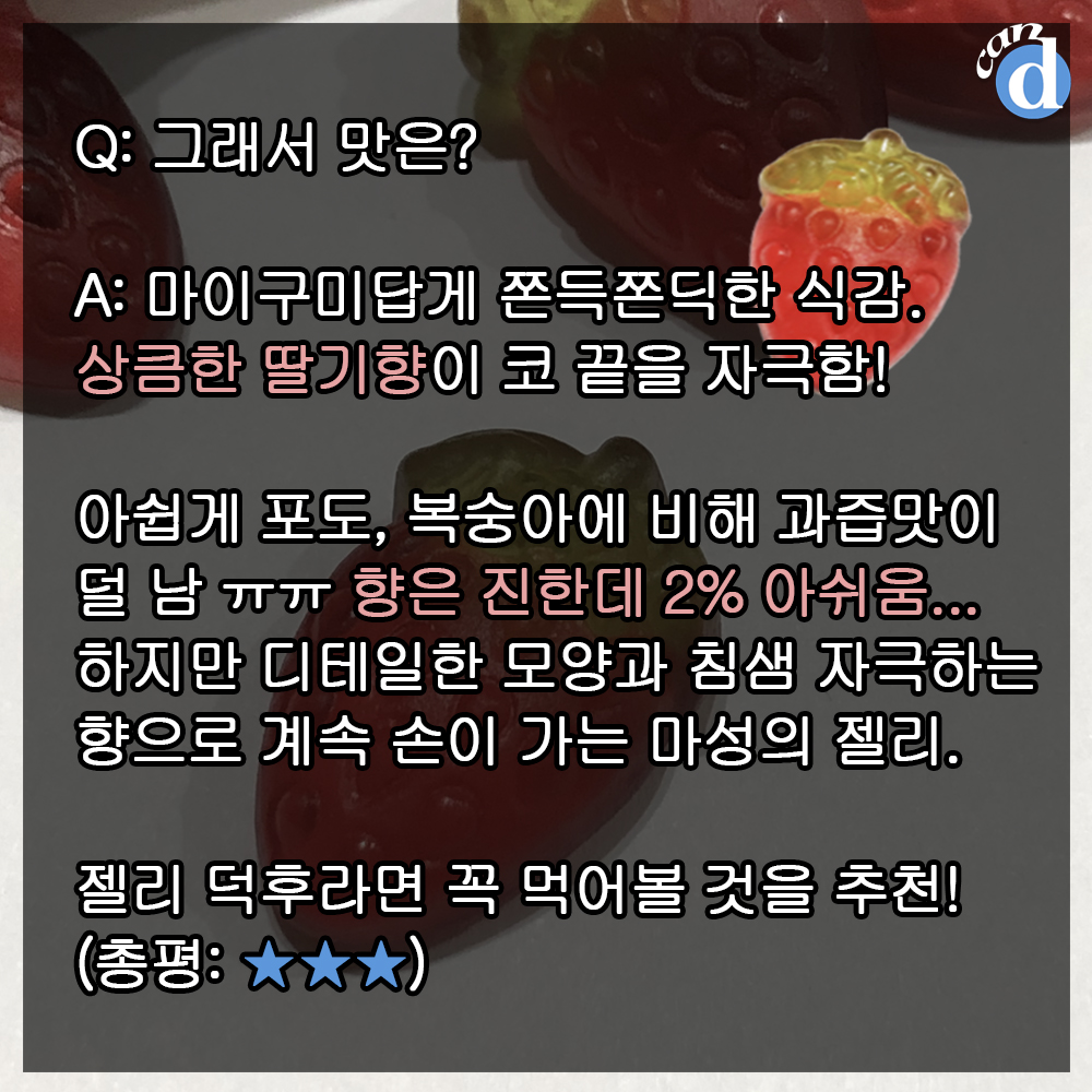분명 코로는 진한 딸기향이 맞는데 입으로는 딸기맛이 맞는지 긴가민가합니다.