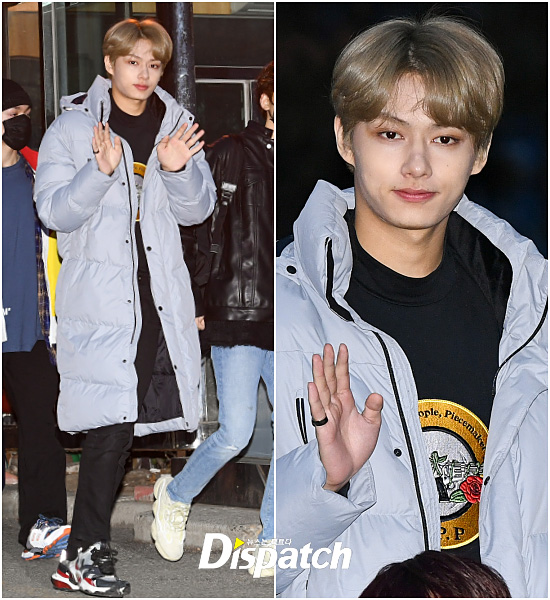'세븐틴' 준은 그레이 롱패딩과 블랙 맨투맨을 매치해 캐주얼한 출근길룩을 완성했다.
