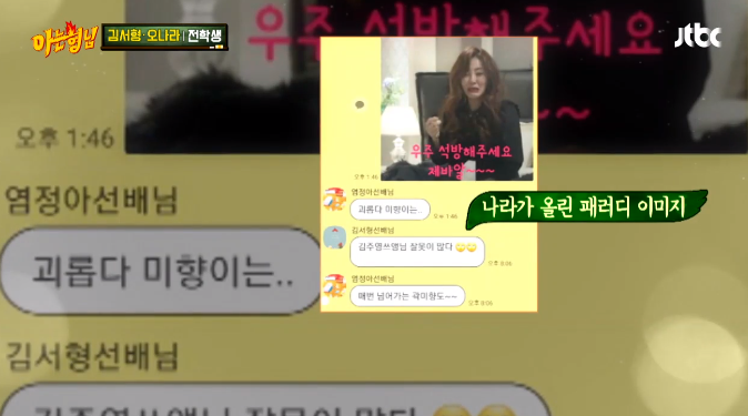 '아는 형님' 멤버들은 단톡방에서 어떤 얘기가 오가는지에 대해 물었는데요. 오나라는 "별 얘기 안 하는데 다들 각자 캐릭터처럼 말한다"고 설명했죠.