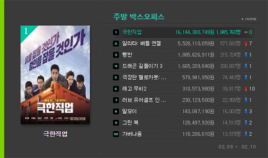 영진위 영화관입장권 통합전산망에 따르면, '극한직업'은 지난 주말(9~10일) 184만 5,760명이 관람했다. 누적 관객 수는 1,283만 5,926명이다.