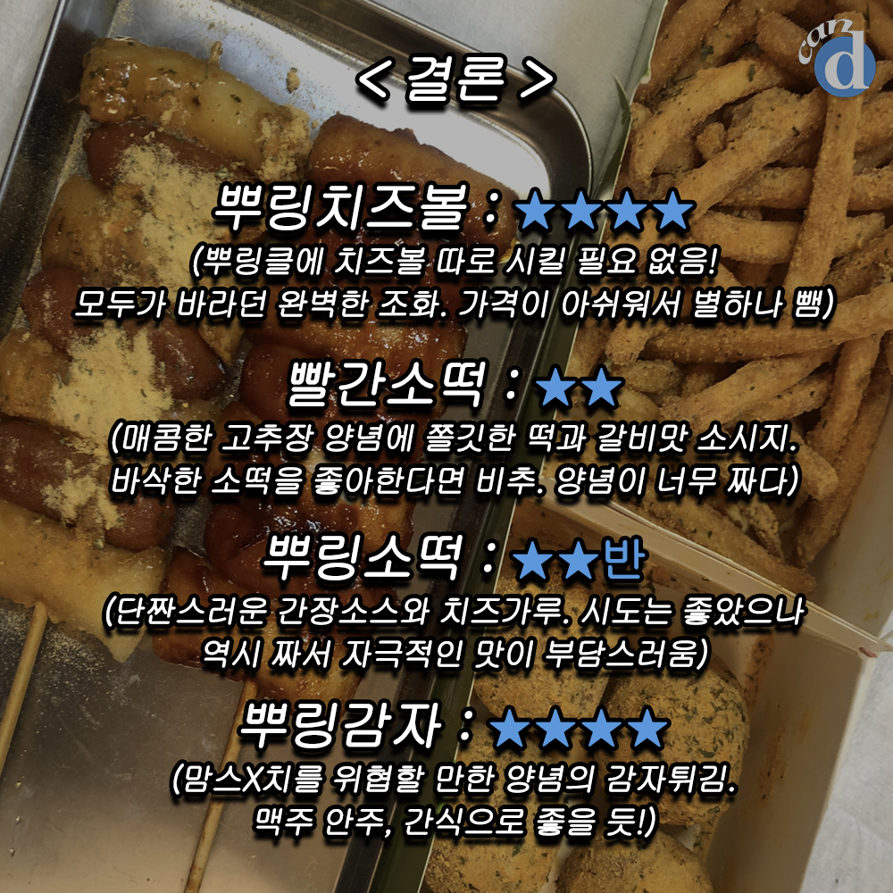 캔디의 신메뉴 추천순은 뿌링치즈볼>> 뿌링감자>>>>넘사벽>>뿌링소떡>빨간소떡이 되겠습니다.