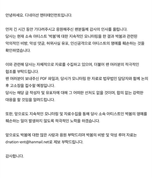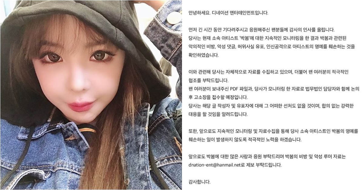 26일 박봄 소속사 디네이션엔터테인먼트는 공식 SNS을 통해 "현재 소속 아티스트 박봄에 대한 지속적인 모니터링을 한 결과 박봄과 관련된 악의적인 비방, 악성 댓글, 허위사실 유포, 인신공격으로 아티스트 명예를 훼손하는 것을 확인했다"고 밝혔다.