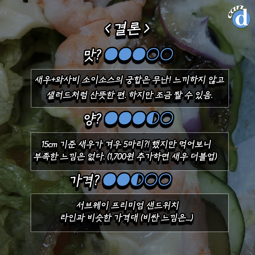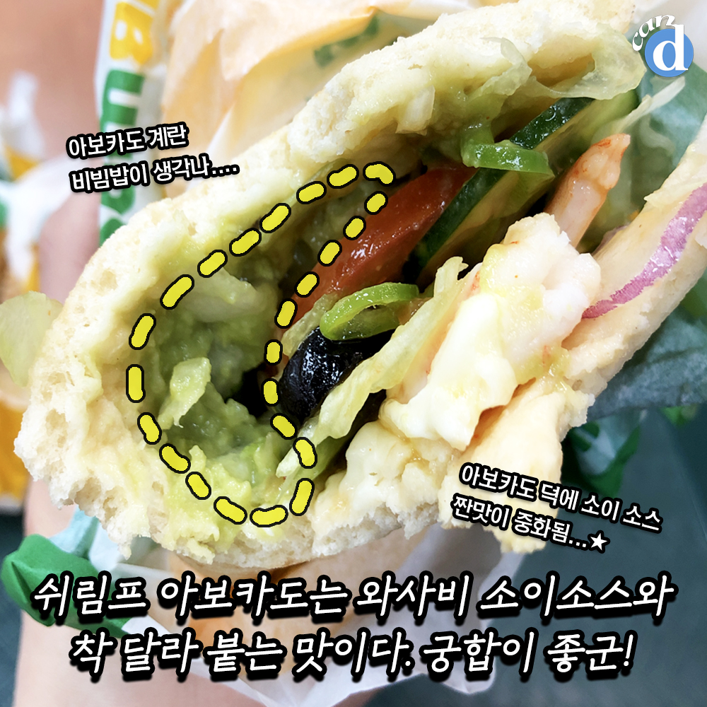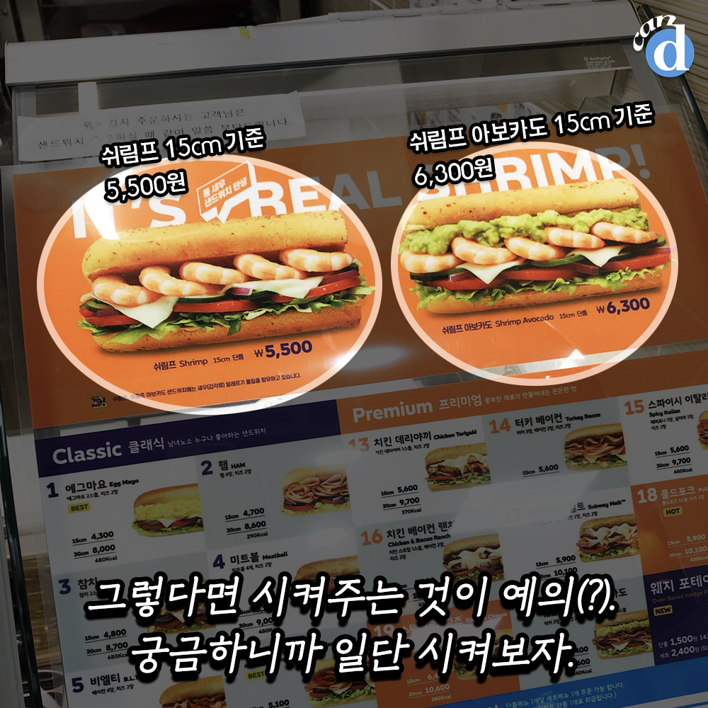 신메뉴 2가지를 15cm 사이즈로 주문했습니다. 쉬림프와 쉬림프 아보카도는 800원 차이네요.
