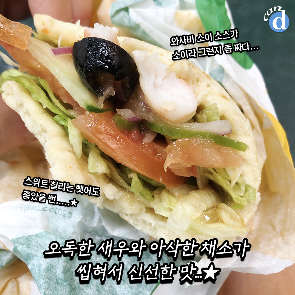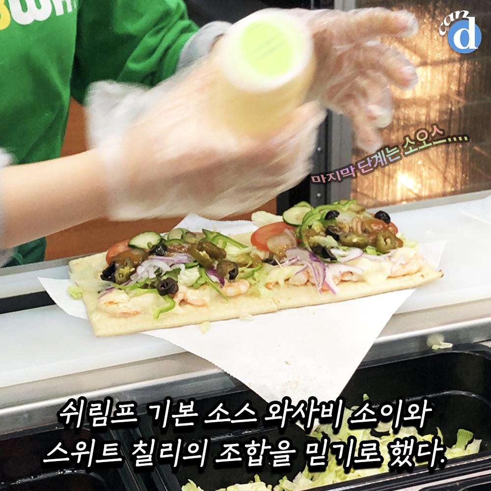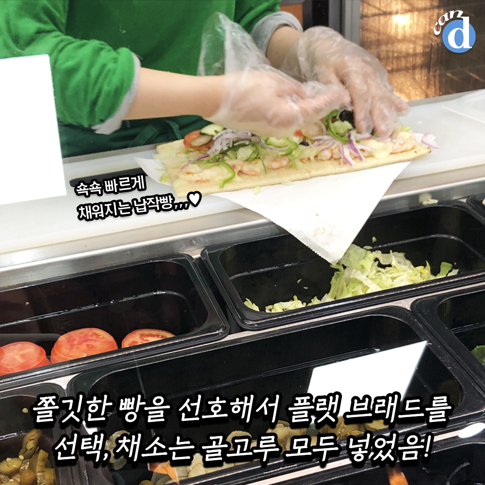 캔디는.... 플랫 브래드+채소 몽땅+와사비 소이 소스+스위트 칠리로 주문합니다.