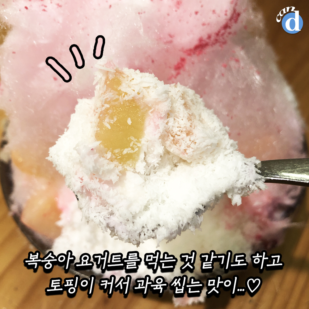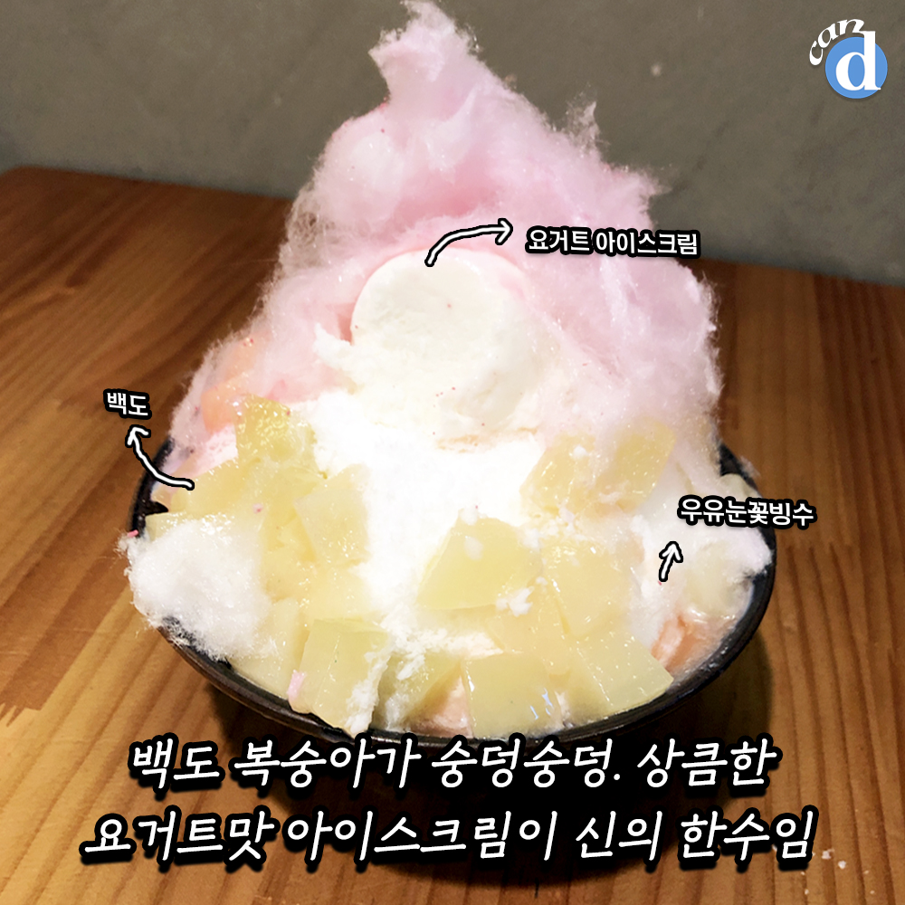 그리고 솜사탕을 싹 걷어주면 요거트 아이스크림, 백도 복숭아, 우유 눈꽃 빙수가 나타납니다.