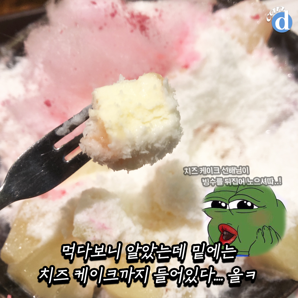 먹다가 빙수 밑 깊숙한 곳에서 치즈 케이크를 발견한 캔디.