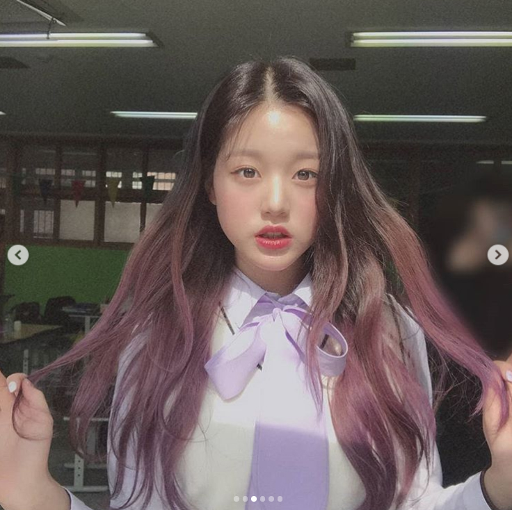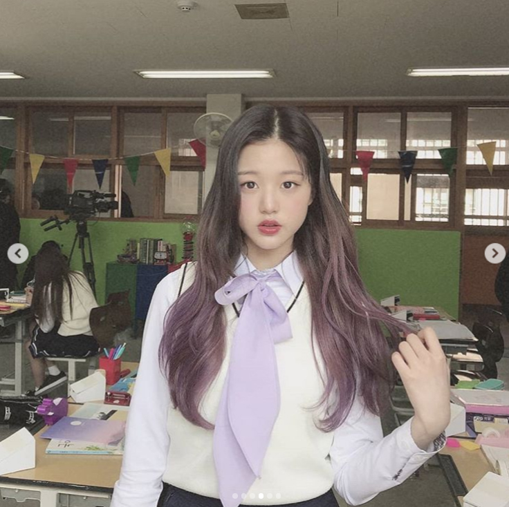 교복이 찰떡같이 어울렸습니다. 흰 블라우스에 아이보리 베스트를 입고 있었고요. 여기에 연보라색 리본을 더했는데요.