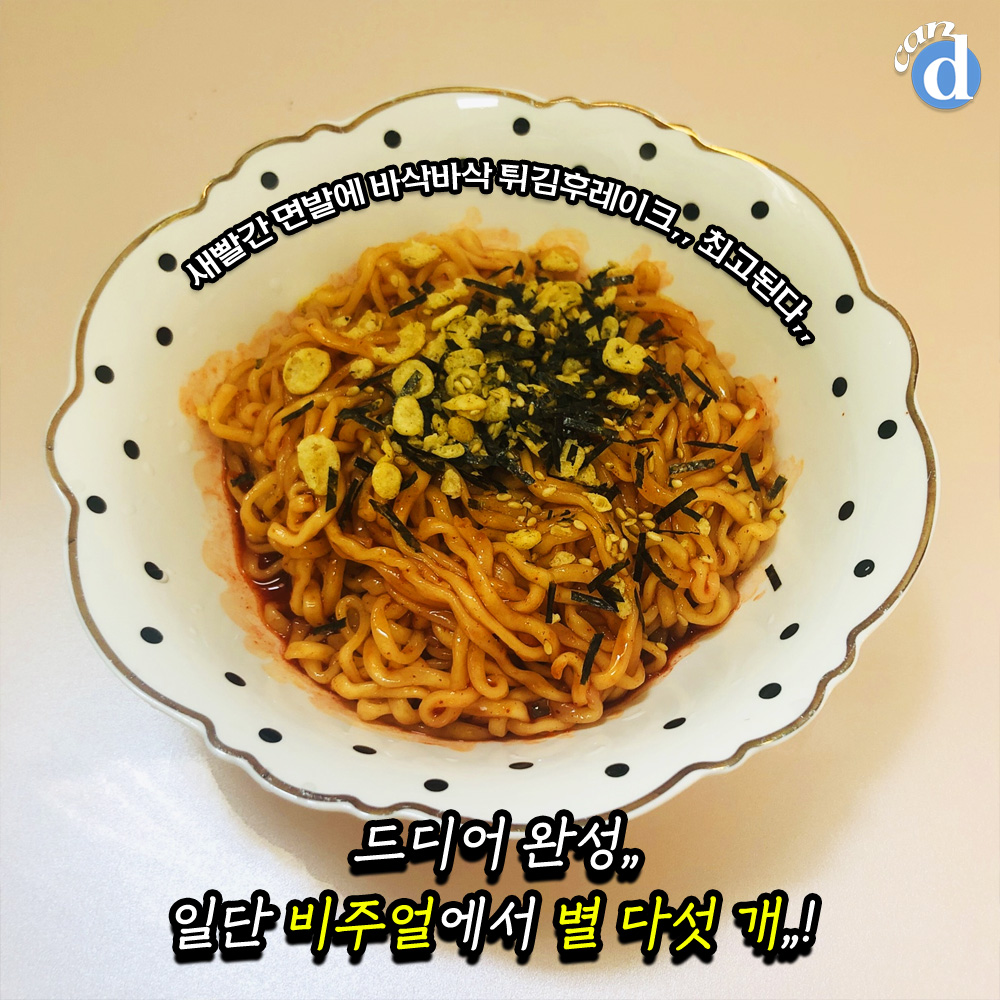 비주얼은 훌륭합니다. 새빨간 면발 위에 바삭바삭한 튀김 후레이크, 비주얼 점수는 만점.