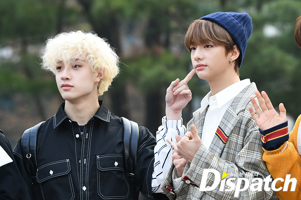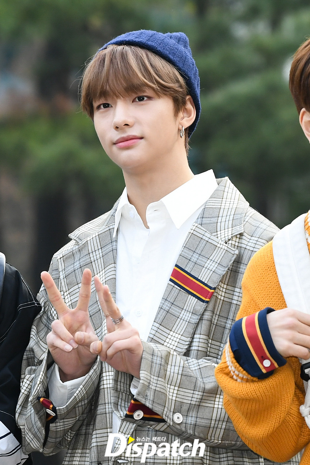 '스트레이키즈' 현진은 체크 자켓과 비니를 매치해 댄디한 패션을 선보였다.
