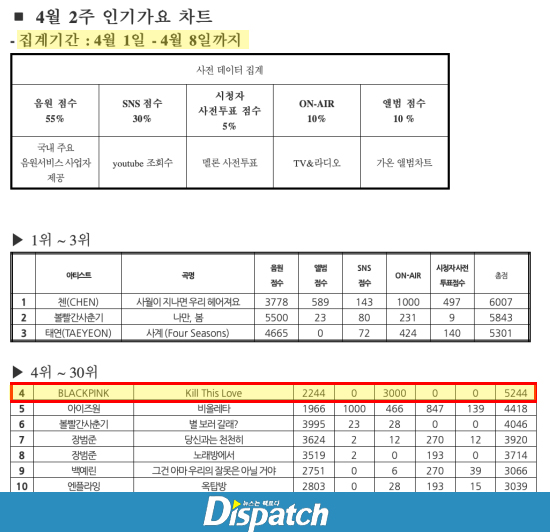 [Dispatch=박혜진기자] "방탄소년단이 4월 셋째 주 차트에서 누락됐습니다. 다른 가수는 같은 기준으로 상위권에 진입했습니다." ('인기가요' 게시판)