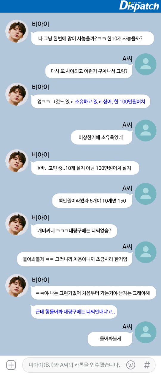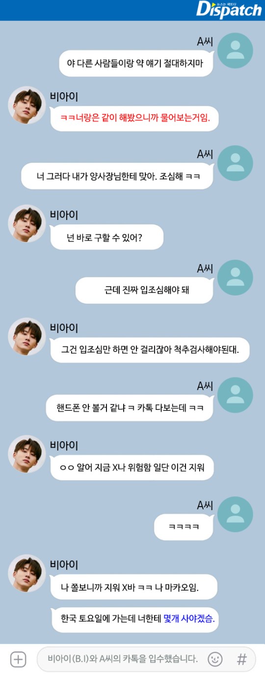 다음은 비아이가 2016년 4월 A씨와 나눈 대화 내용이다.