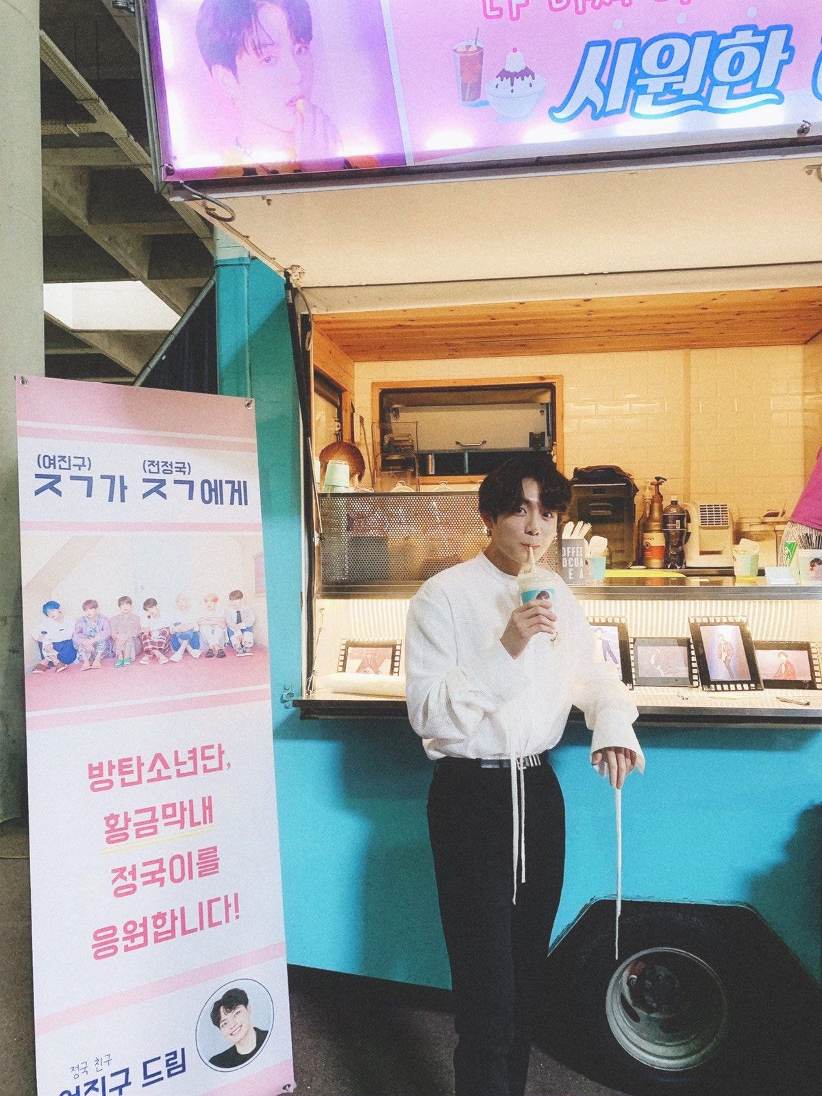 두 사람의 우정은 훈훈 그 자체입니다. 앞서 정국이 지난 4월 드라마 촬영을 응원하기 위해 같은 멘트로 간식차를 선물했습니다.
