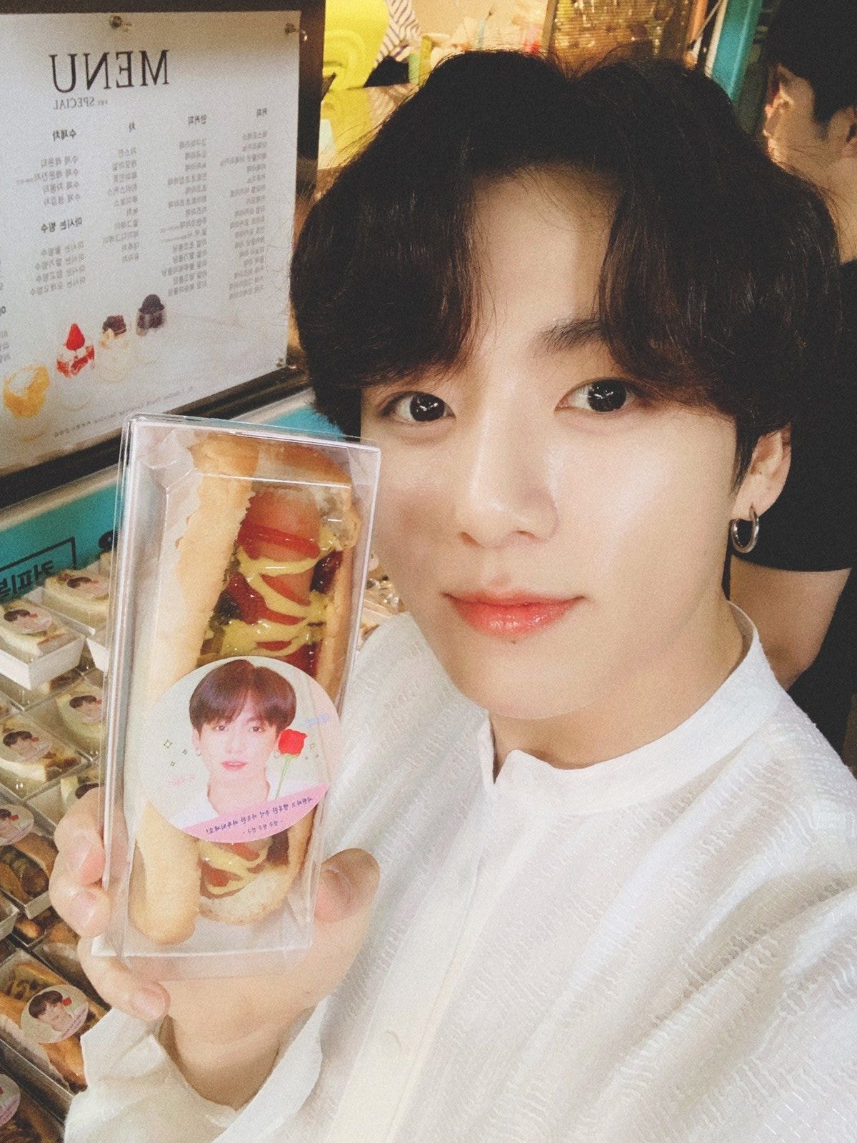 여진구는 센스가 넘쳤습니다. 평소 정국이 좋아하는 핫도그를 메뉴에 넣은 건데요. 정국은 핫도그와 음료를 들고 행복해 하는 모습이었습니다.