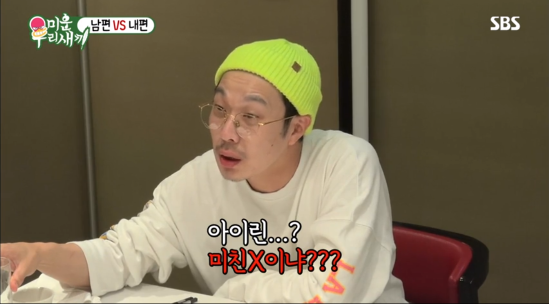 김종민의 아이린 언급에 하하는 급 정색했습니다. "아이린? 미친X이냐?"라고 쐈습니다. 이에 김종국과 별 등은 빵 터졌죠.