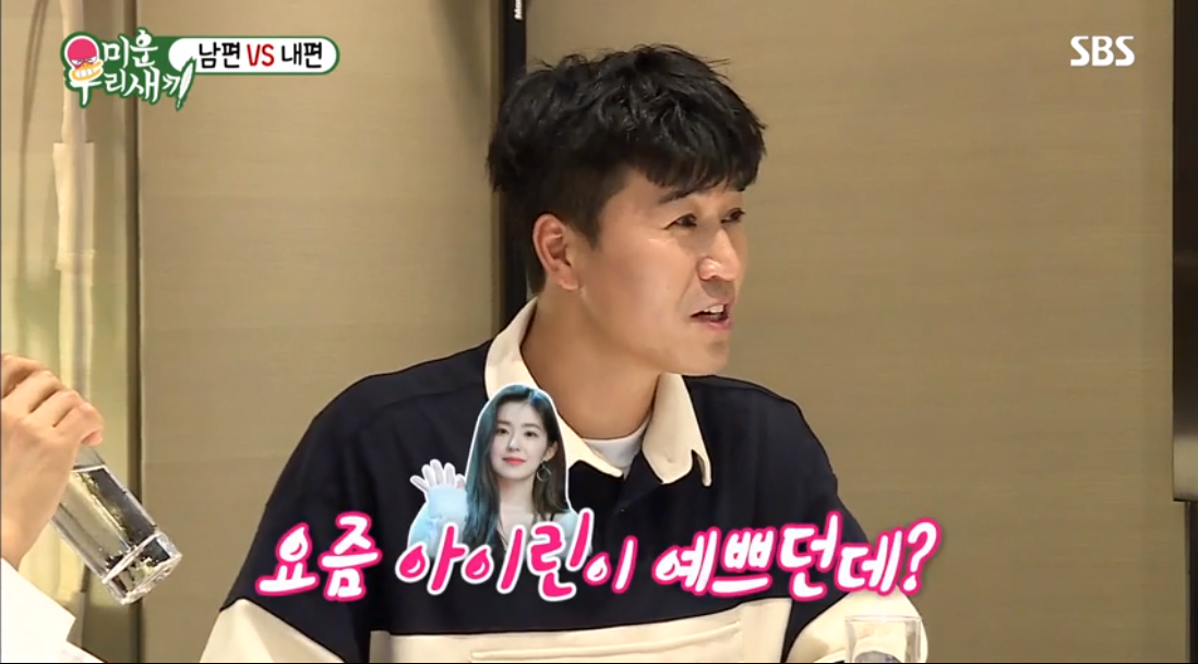 김종국은 김종민에 "관심가는 연예인 있어? 얘기해봐"라고 말했습니다. 김종민은 멋쩍어 하며 "아 그냥 예쁘다고 하는 건데?"라 하다가 "아이린이 예쁘던데?"라고 했습니다.