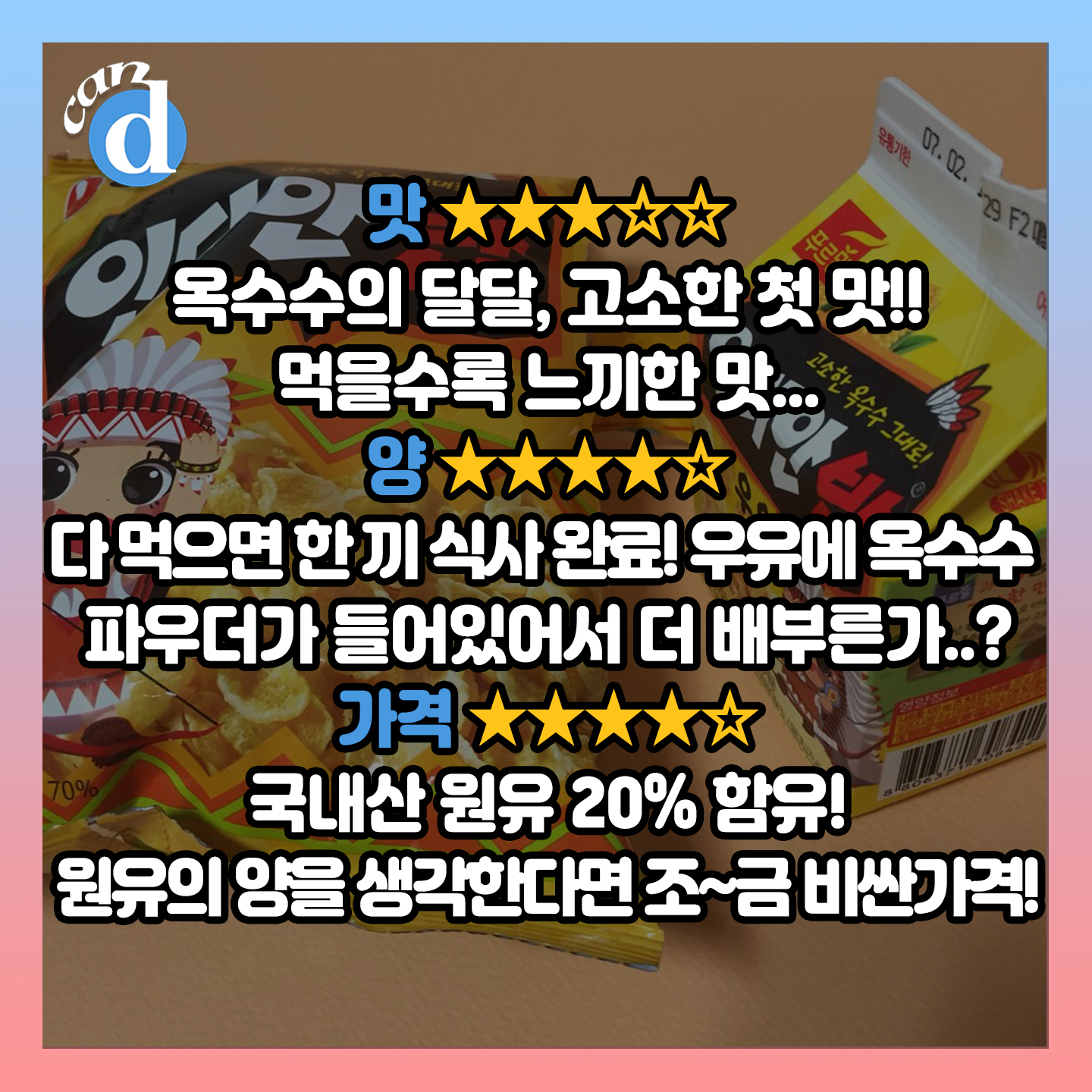 첫 맛은 달콤한 옥수수 우유 맛이었지만 끝 맛은 인공 옥수수 맛이 느끼하게 남았습니다.