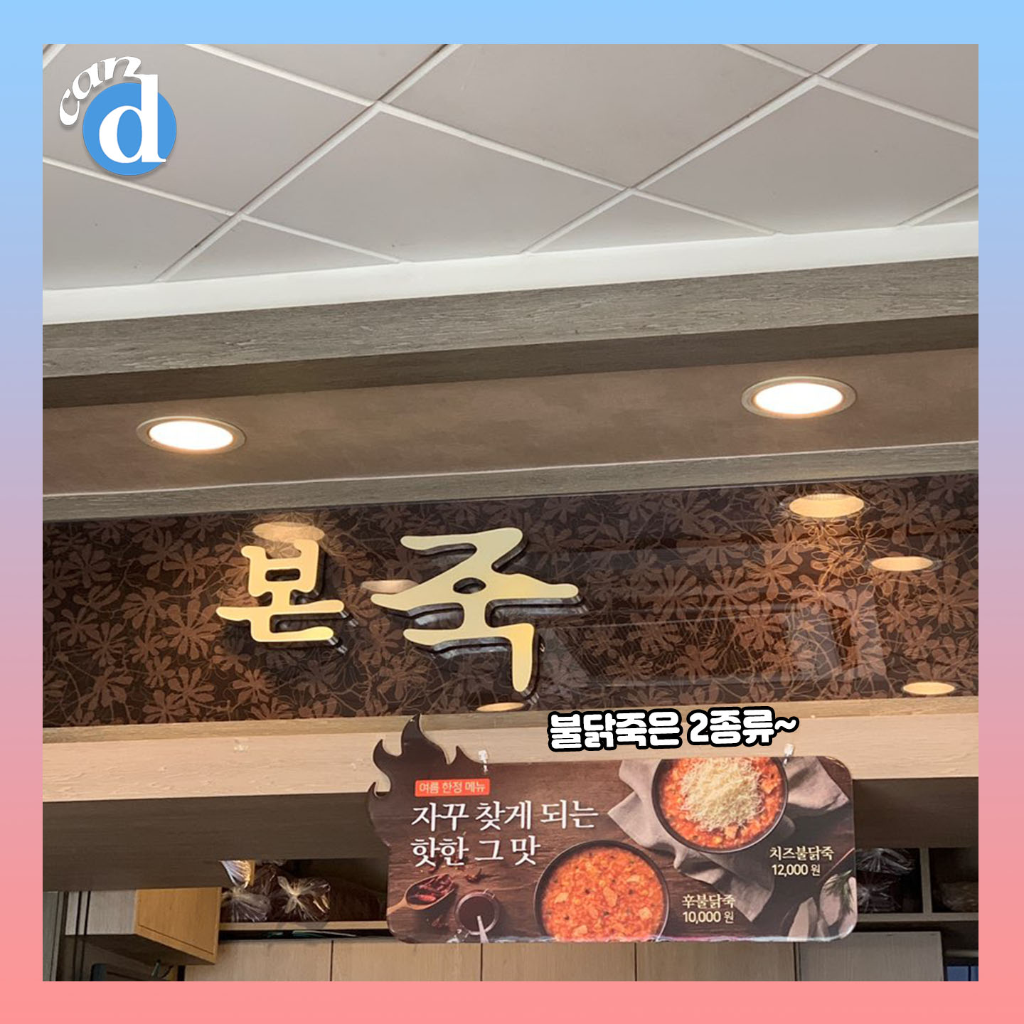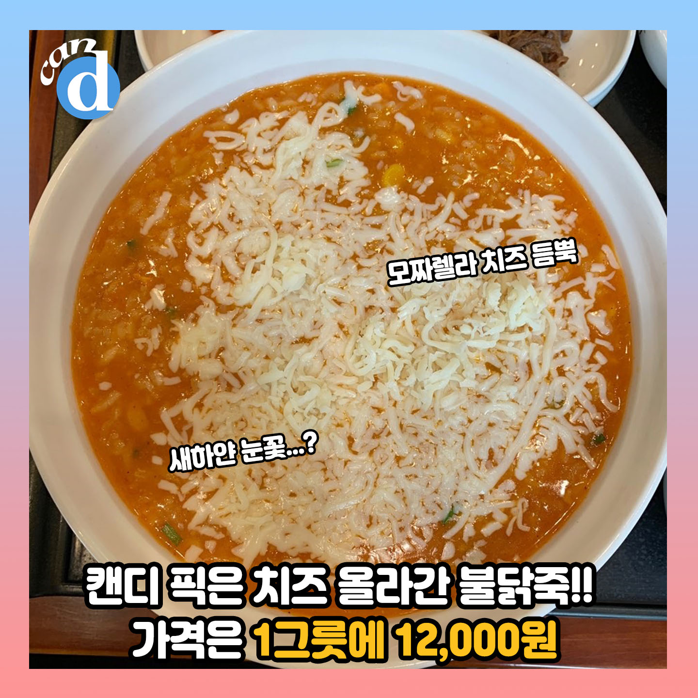 덜컥 겁이 난 캔디는 치즈 토핑 올라간 '치즈 불닭죽'을 맛보았습니다. 1그릇에 12,000원인데요.