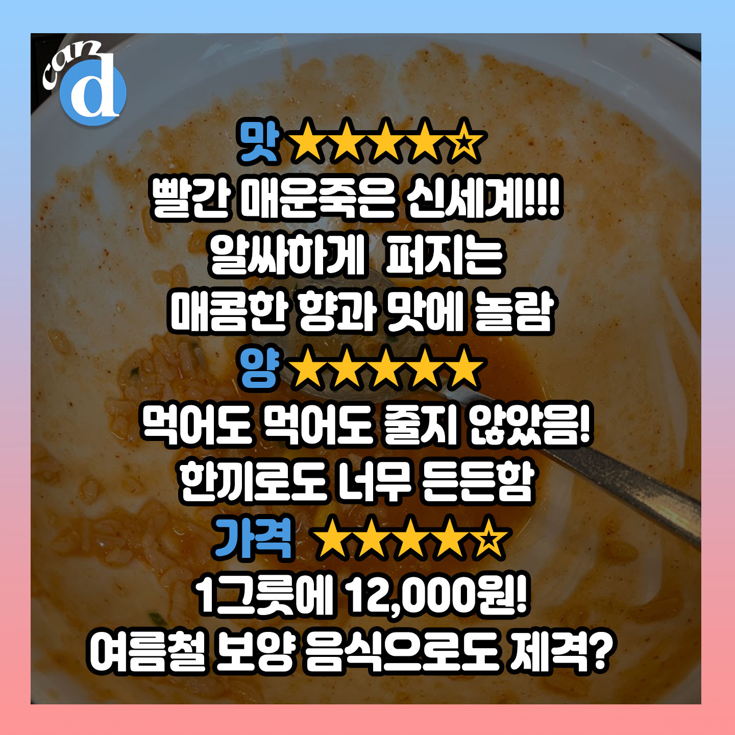 그래서 캔디의 결론은요? 맵찔이도 호기심이 생겼다면 치즈불닭죽은 한번쯤 도전해봐도 좋을 것 같습니다.