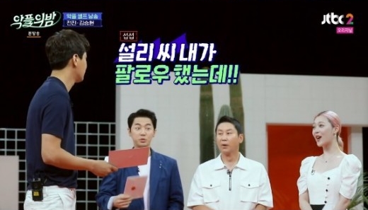이 말에 김숙은 "아 왜?"라고 걱정을 했으며 김종민 역시 "미쳤어?"라고 놀랐다. 신동엽은 "착하고 늘 경청만 하는 설리가 죽여버려라는 표정이었다"고 말했다. 이 말에 설리는 "아니다"고 해명했다.