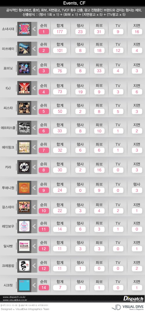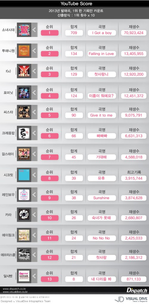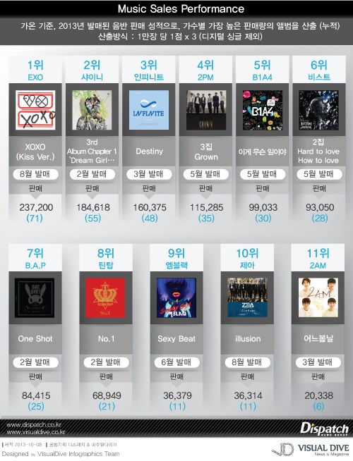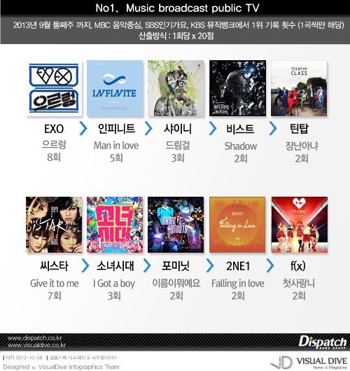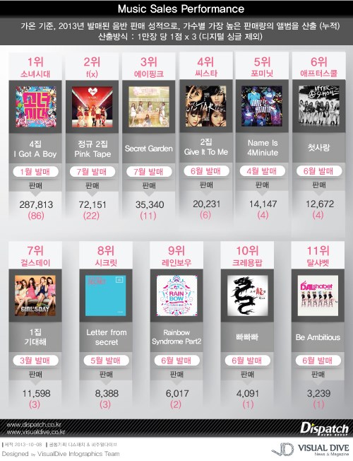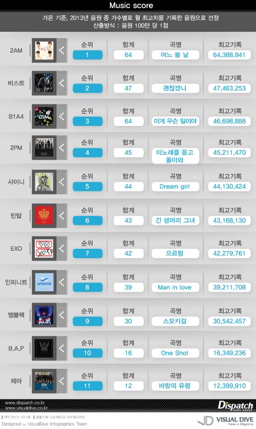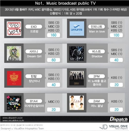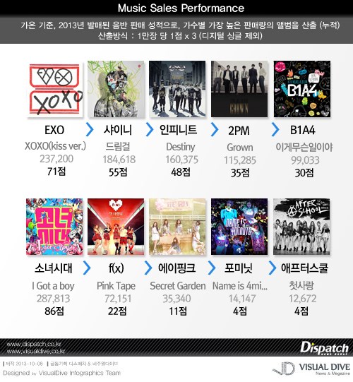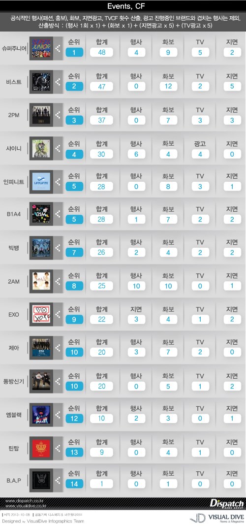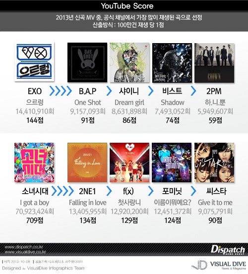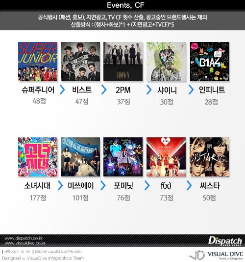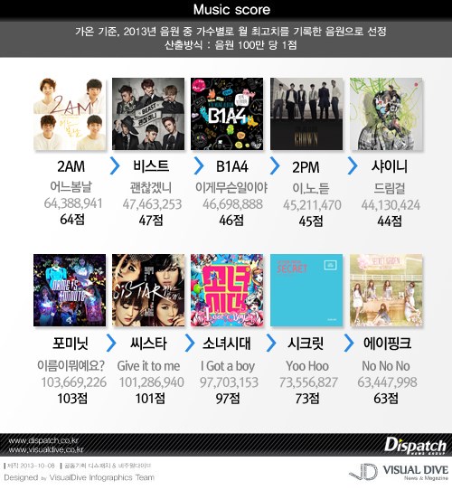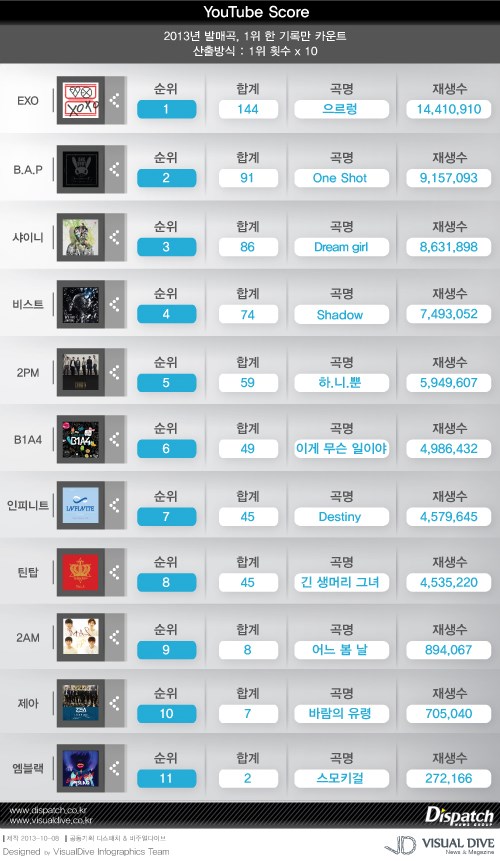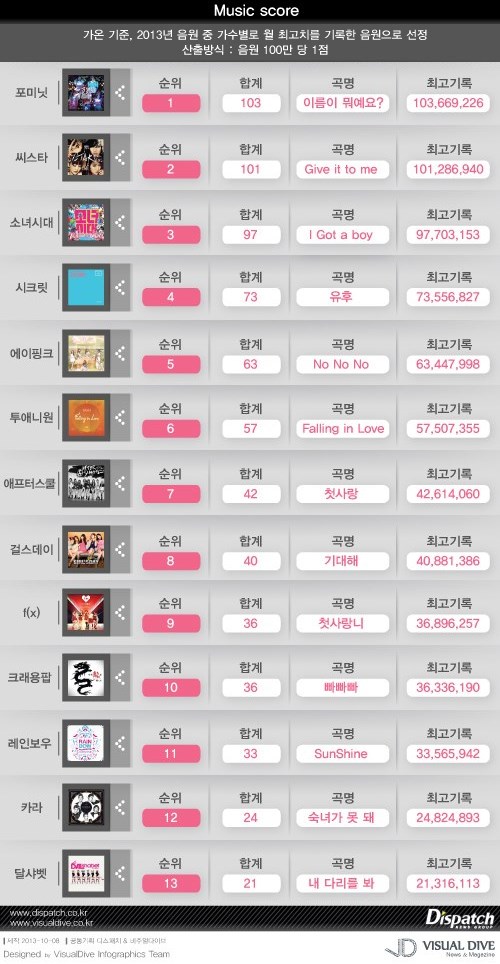'디스패치'가 선정한 <2013 아이돌 순위>는, 주관화의 객관화 작업이다. 남녀 아이돌의 실제 인기를 측정하기위해 수치화에 도전했다. ▶음원, ▶ 음반, ▶유투브, ▶아이튠즈, ▶ 음악방송, ▶ 광고행사, ▶ 팬클럽수 등의 실적을 집계해 순위를 매겼다.