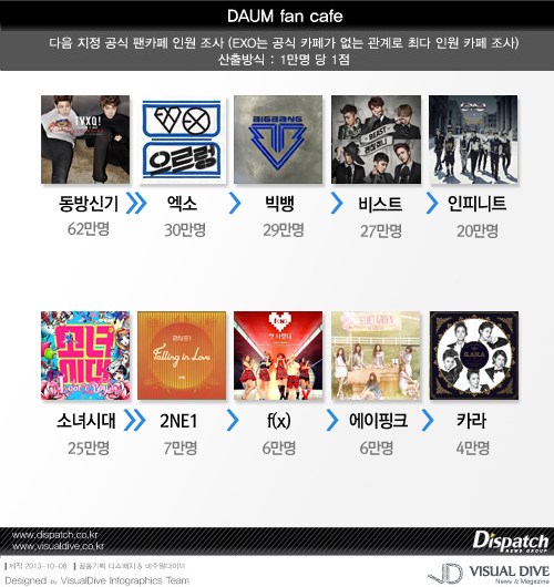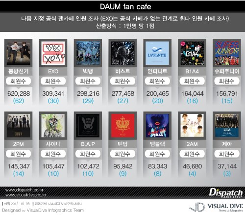 ▶ 기준 : 포털 사이트 다음에서 지정한 공식 팬카페 인원을 조사했다. 일정 기간의 가입량을 측정할 수 없어 누적으로 했다. 단, 엑소는 공식 카페가 없는 관계로 최다 인원 카페 회원수를 기준으로 했다. 기준일은 2013년 9월 31일이다.