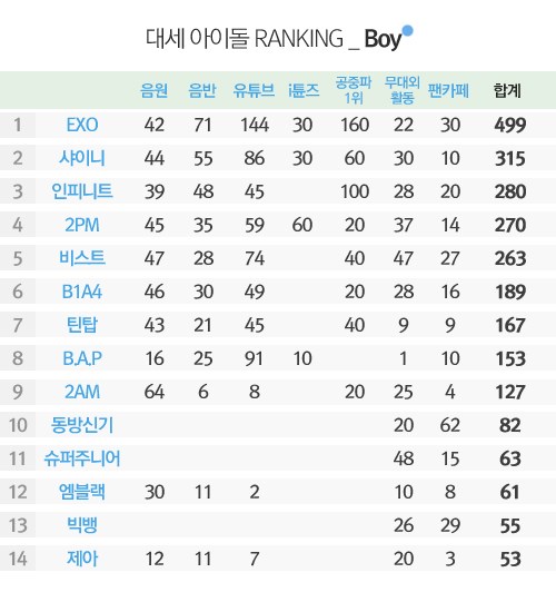 ④ 아이튠즈 : 해외 시장의 척도다. 여자는 '소녀시대', '투애니원','에프엑스' 단 3팀만 점수를 얻었다. 남자는 '2PM', '샤이니', '엑소', 'B.A.P' 등 4그룹만 점수를 획득했다. 대부분 아시아 차트 1위를 기록했다. 아시아 시장에서의 입지를 알 수 있는 부분이다.