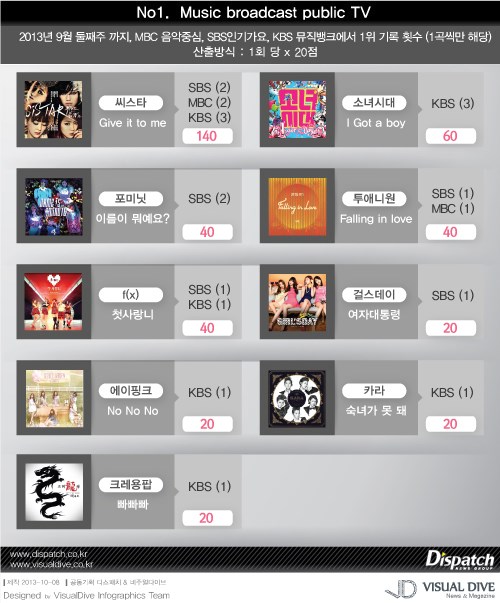 ▶ 디패 점수 산출법 : 2013년 1월부터 9월 2째주까지를 기간을 잡았다. 케이블을 제외한 지상파 1위 횟수만 집계했다. 1위 횟수당 20의 가중치를 곱했다. 보통 신곡 활동 기간이 4주 정도인 것을 고려, 트로피의 희소성에 가치를 부여했다.