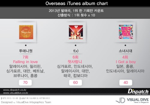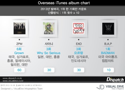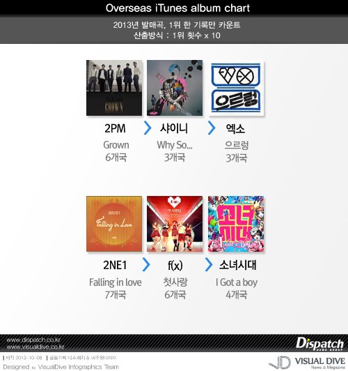 ▶ 기준 : 2013년 발매된 아이돌 앨범의 해외 성적이다. 기준은 아이튠즈 앨범 차트로 했다. 단, 개별 곡이 아닌 앨범 전체로 한정지었다. 단, 앨범 차트 1위곡만 카운트를 했다. 기간은 1월부터 9월이다.